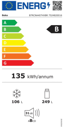 Jährlicher Energieverbrauch 135 kWh, auf der Grundlage von Ergebnissen der Normprüfung über 24 Stunden. Der tatsächliche Verbrauch hängt von der Nutzung und vom Standort des Geräts ab.